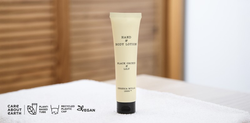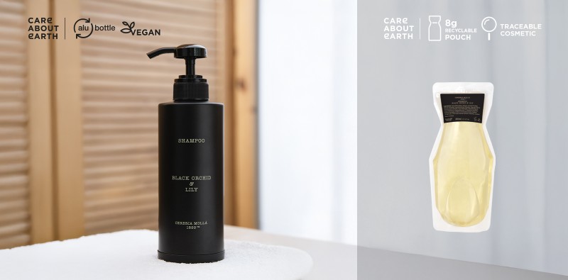 Incluye el sistema Ecofill Slim, un dispensador recargable patentado con bolsas selladas de 300 ml, desarrollado para un uso hotelero seguro, eficiente y elegante, que combina estética y responsabilidad medioambiental. Un tubo de loción de 30 ml y un jabón sólido de 20 g completan la oferta.